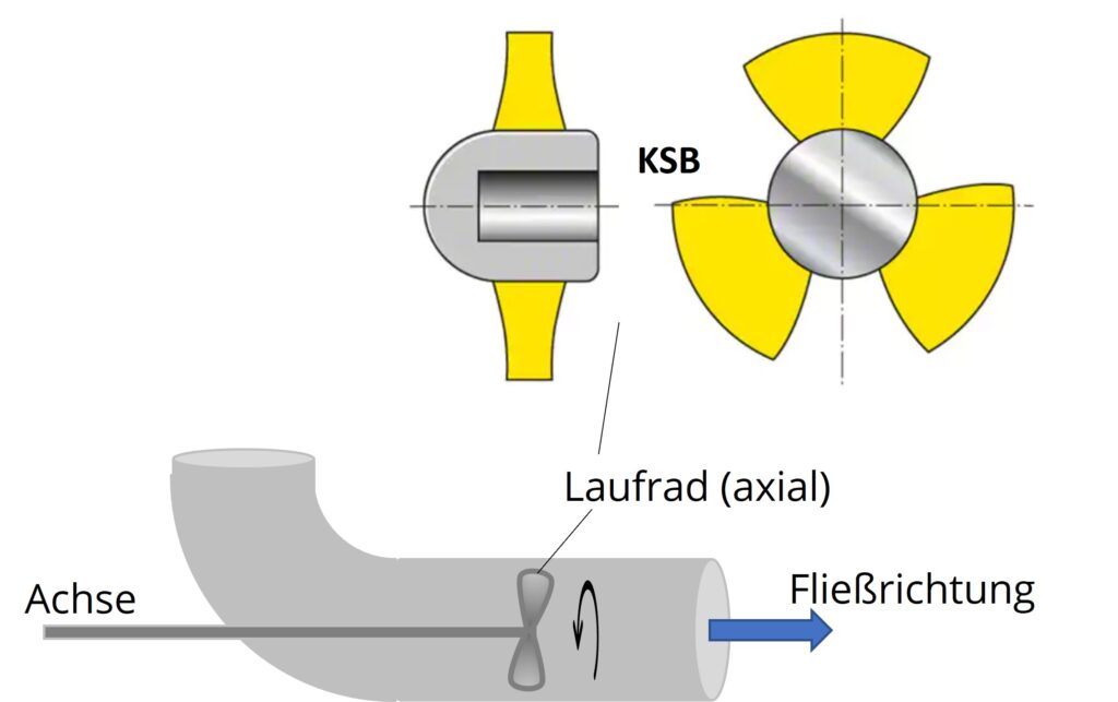 Axialpumpe Pumpe, bei der das Wasser parallel zur Achse transportiert wird. Das Axial-Laufrad (Impeller) muss folglich so geformt sein, dass eine propellerähnliche Wirkung zur Bewegung des Wassers erzielt wird.