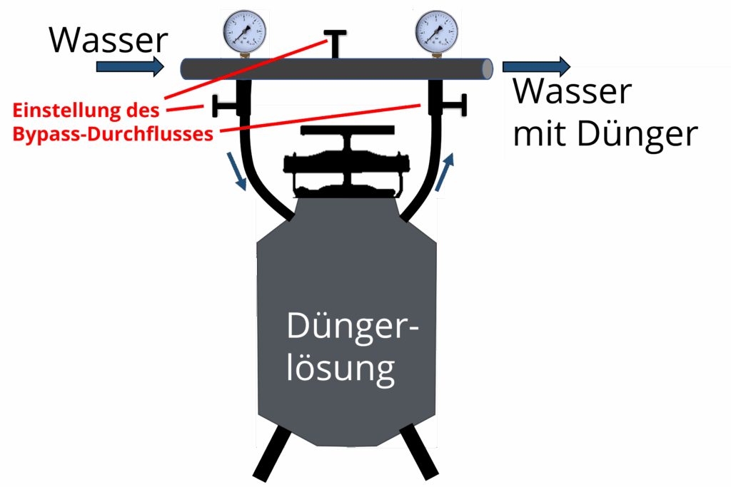 Bei der Düngereinspeisung mit dem Düngetank (pressure differential tank) wird Wasser mittels Bypass durch einen mit Düngerlösung gefüllten Tank geleitet. Dies führt zu einer stetigen Abnahme der Düngerkonzentration im Düngetank, weshalb auch die Düngerkonzentration im Bewässerungswasser mit zunehmender Dauer abnimmt.
