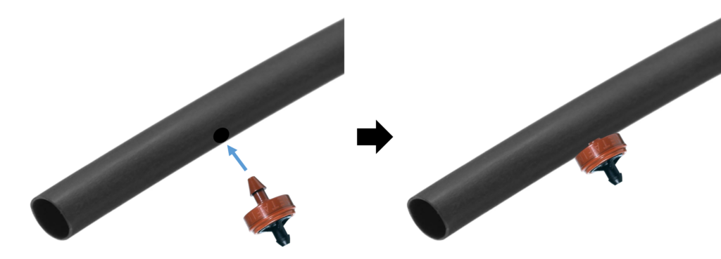 Einzel-Tropfer (online dripper) (→ Tropfer) werden in vom Nutzer gewählten Abständen in vorher angebrachte Löcher im Wasserrohr gesteckt. Zum Anfertigen der Löcher wird eine spezielle Lochzange verwendet. Als Wasserrohre werden üblicherweise16 mm oder 20 mm PE-Schläuche verwendet.