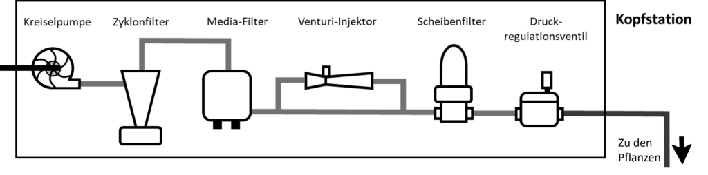 Die Kopfstation umfasst Komponenten zur Wasserbereitstellung und Wasseraufbereitung. Sie ist insbesondere bei ortsfesten Bewässerungsverfahren (Rohrberegnung, Mikrobewässerung) der zentrale Systemteil, von dem aus das Wasser mittels Rohre zu den Pflanzen transportiert und dort appliziert wird. Eine typische Kopfstation für die Tropfbewässerung ist unten dargestellt.