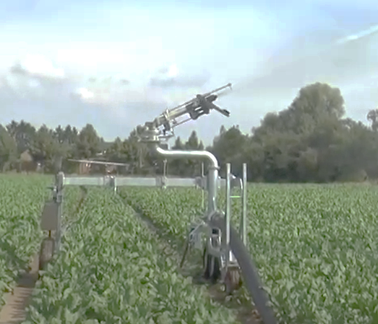Die mobile Beregnung kann mit Rohrtrommelberegnungsmaschine und Regnerwagen durchgeführt werden. Bei diesem Bewässerungsverfahren (Einzelregnerverfahren) ist das PE-Rohr der Maschine mit einem Starkregner verbunden, der auf dem Regnerwagen angebracht ist.