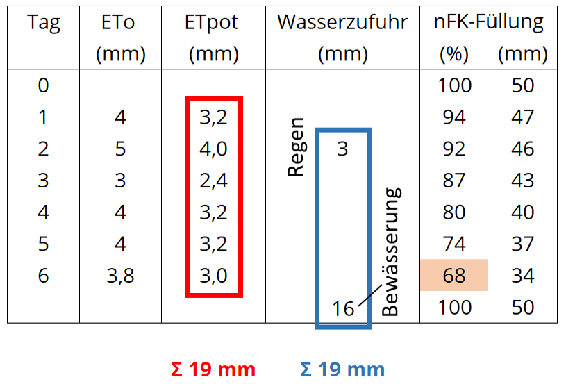 Dabei wurden die ETpot – Verluste (19 mm) durch Regen (3 mm) und Bewässerung (16 mm) wieder ausgeglichen.